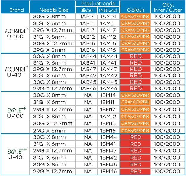 - 29G, 30G, 31G & needle sizes 6mm, 8mm, & 12.7mm
